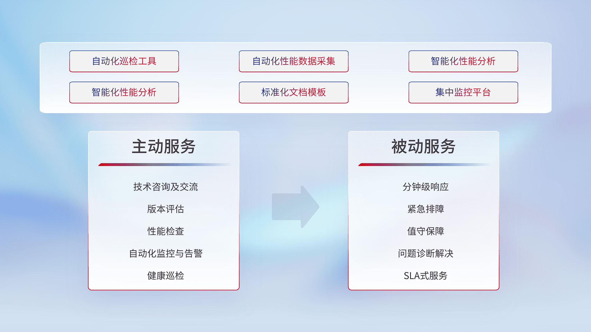 智能化工具和标准化文档,,保障服务质量,,,提供主动服务(包含技术咨询、、、、版本评估、、、性能检查、、、、自动化监控与告警、、健康巡检)和被动服务包含(分钟级响应、、、、紧急排障、、、值守保障、、、问题诊断解决、、SLA服务)。。。